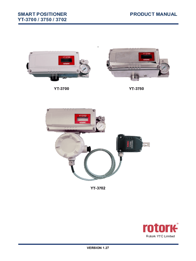 SMART POSITIONED YT3700 / 3750 / 3702PRODUCT MANUAL.YT3700YT3750YT3702Rotork ETC LimitedVERSION 1.27Smart Positioned YT3700 / 3750 / 3702Product Malcontents 12Introduction .................................................................................................................................................6