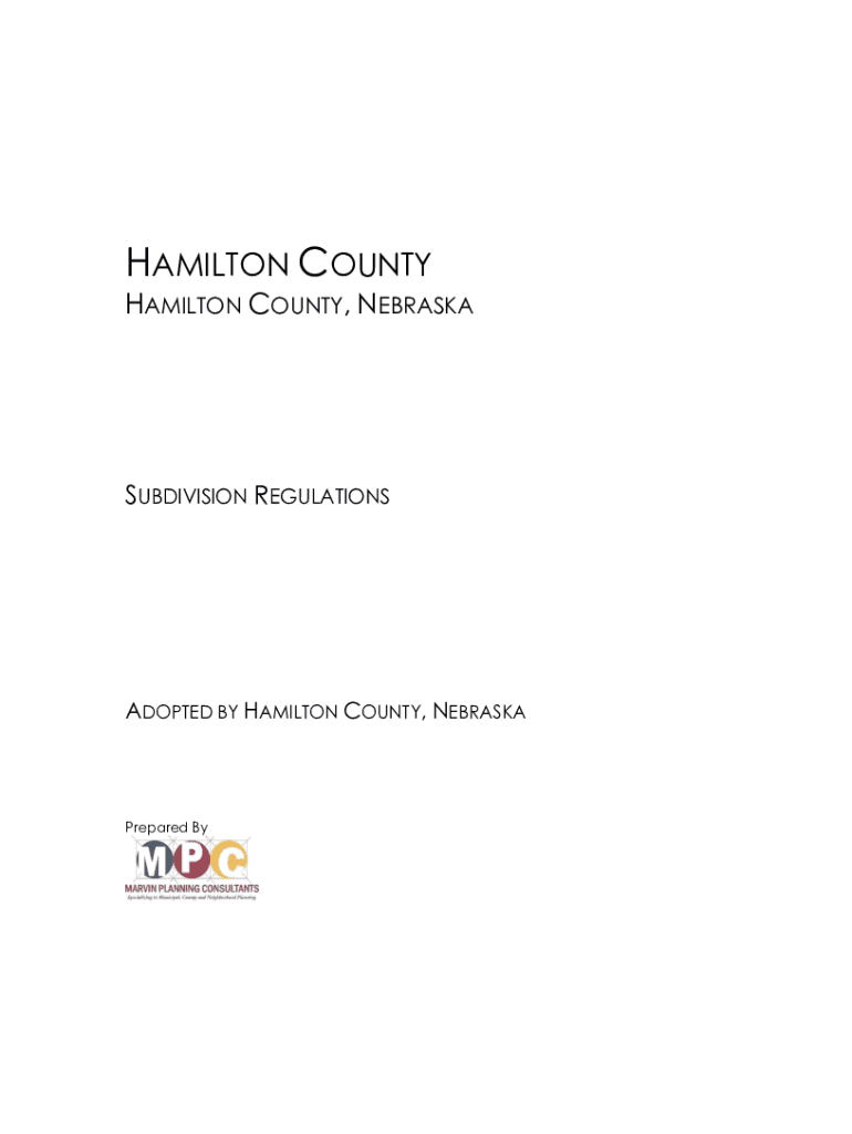HAMILTON COUNTY, NEBRASKASUBDIVISION REGULATIONSADOPTED BY HAMILTON COUNTY, NEBRASKAPrepared Notable OF CONTENTS