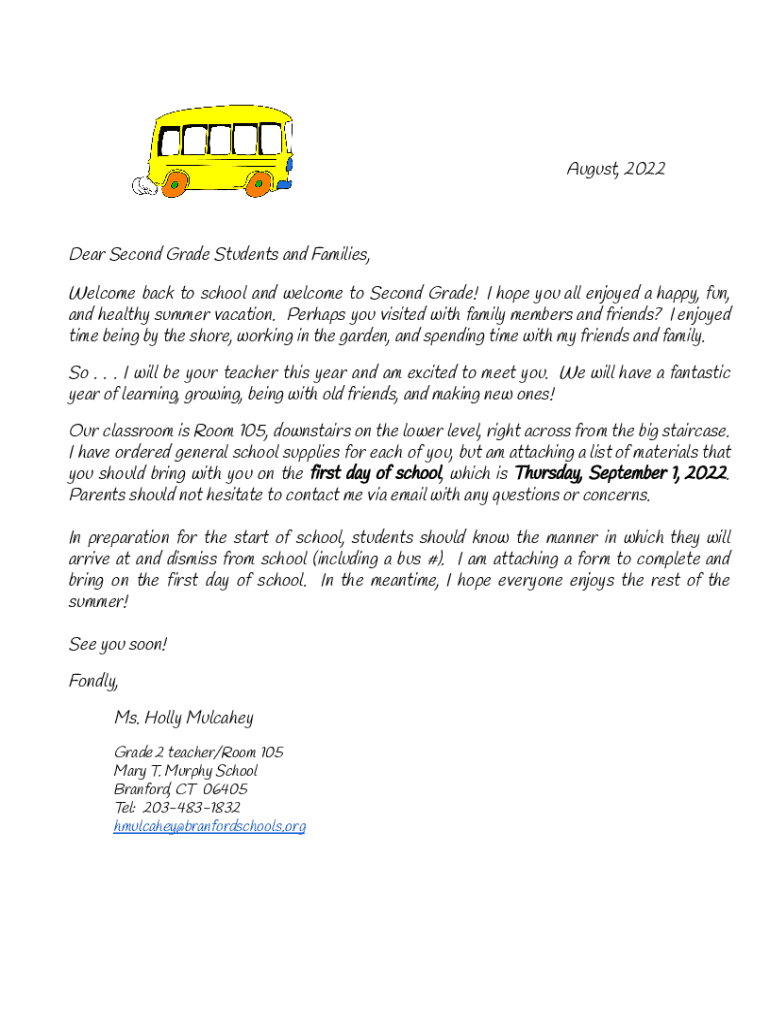 August, 2022Dear Second Grade Students and Families, Welcome back to school and welcome to Second Grade! I hope you all enjoyed a happy, fun, and healthy summer vacation. Perhaps you visited with
