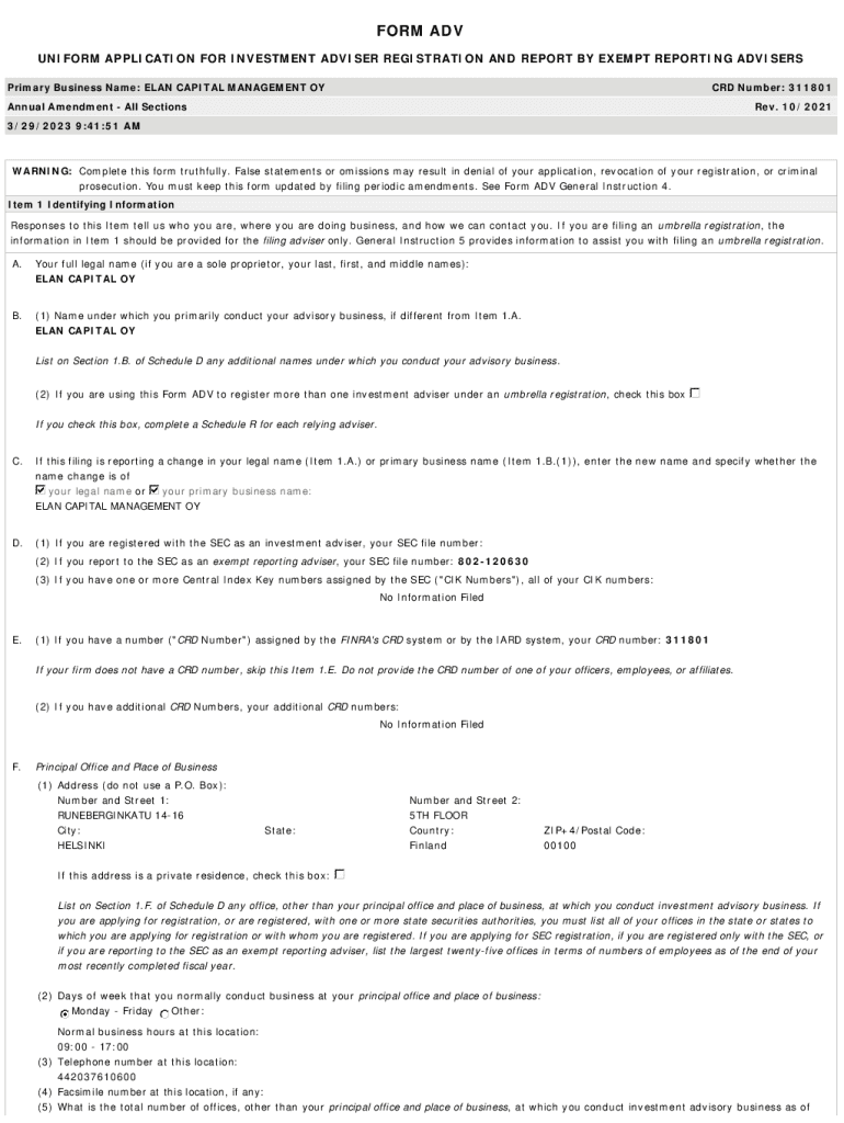 Get the free ELAN CAPITAL OYForm ADV