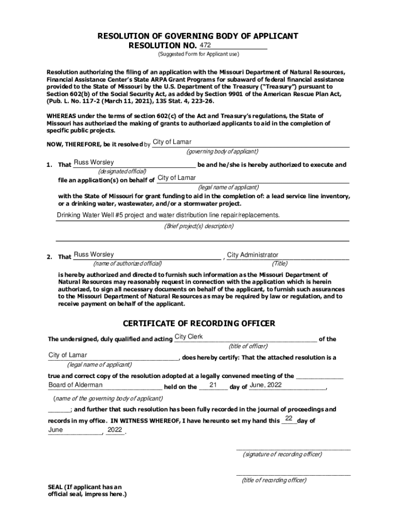 RESOLUTION OF GOVERNING BODY OF APPLICANT 472 RESOLUTION NO. ___ (Suggested Form for Applicant use)Resolution authorizing the filing of an application with the Missouri Department of Natural Resources,