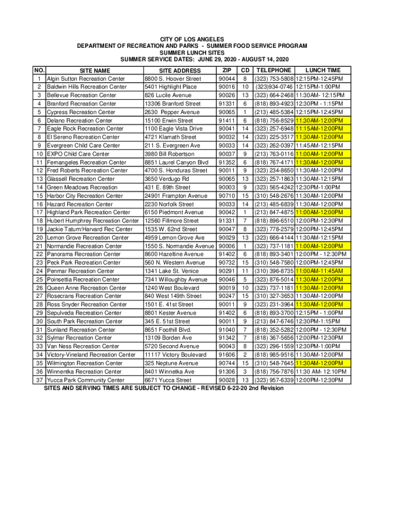 CITY OF LOS ANGELES DEPARTMENT OF RECREATION AND PARKS SUMMER FOOD SERVICE PROGRAM SUMMER LUNCH SITES SUMMER SERVICE DATES: JUNE 29, 2020, AUGUST 14, 2020, NO. ZIP CD TELEPHONE SITE NAME SITE ADDRESS