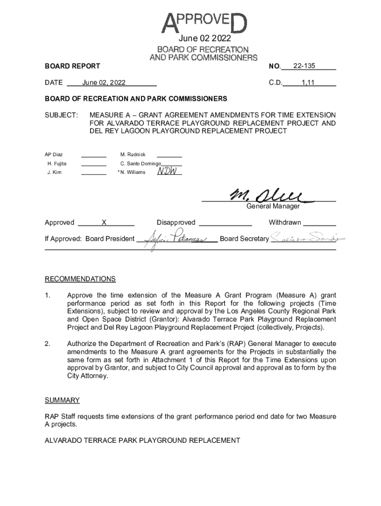 June 02, 2022, BOARD REPORT June 02, 2022DATENO.22135C. D.1,11BOARD OF RECREATION AND PARK COMMISSIONERS SUBJECT:MEASURE A GRANT AGREEMENT AMENDMENTS FOR TIME EXTENSION FOR ALVARADO TERRACE PLAYGROUND