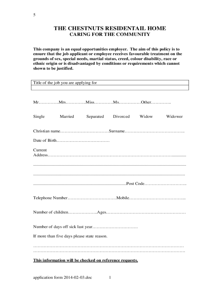 5THE CHESTNUTS RESIDENTIAL HOME CARING FOR THE COMMUNITY This company is an equal opportunities' employer. The aim of this policy is to ensure that the job applicant or employee receives favorable