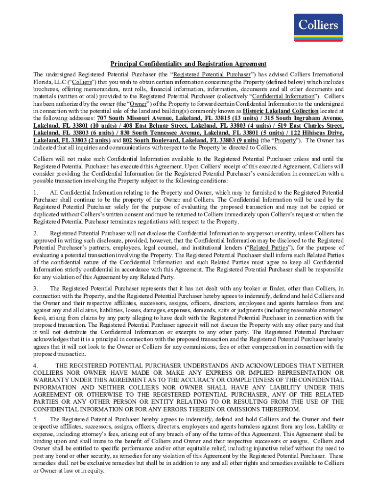 Principal Confidentiality and Registration Agreement The undersigned Registered Potential Purchaser (the Registered Potential Purchaser) has advised Colliers International Florida, LLC (Colliers)