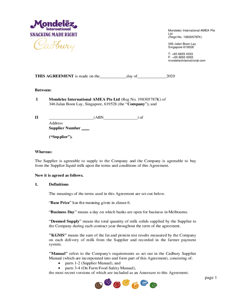 Mondelez International AREA PTE Ltd (Reign No. 198305787K) 346 Japan Boon Lay Singapore 619528 T: +65 6829 4333 F: +65 6265 0093 mondelezinternational. This AGREEMENT is made on the_day of2020Between: