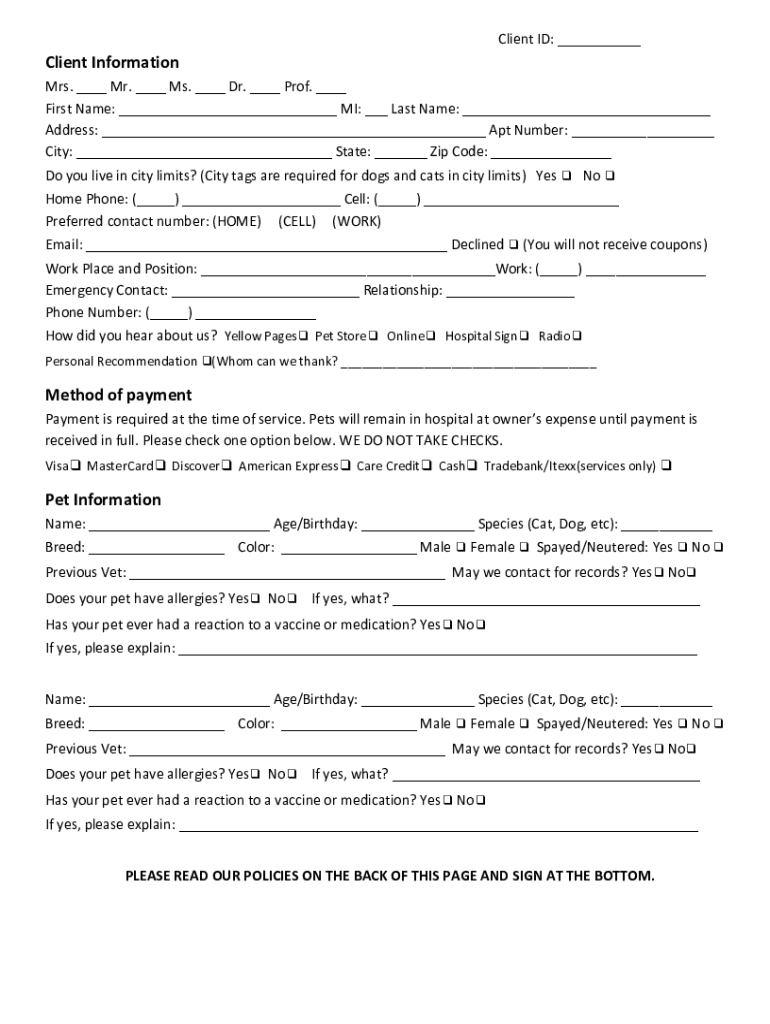Client ID: ___Client Information Mrs. ___ Mr. ___ Ms. ___ Dr. ___ Prof. ___ First Name: ___ MI: ___ Last Name: ___ Address: ___ Apt Number: ___ City: ___ State: ___ Zip Code: ___ Do you live in city