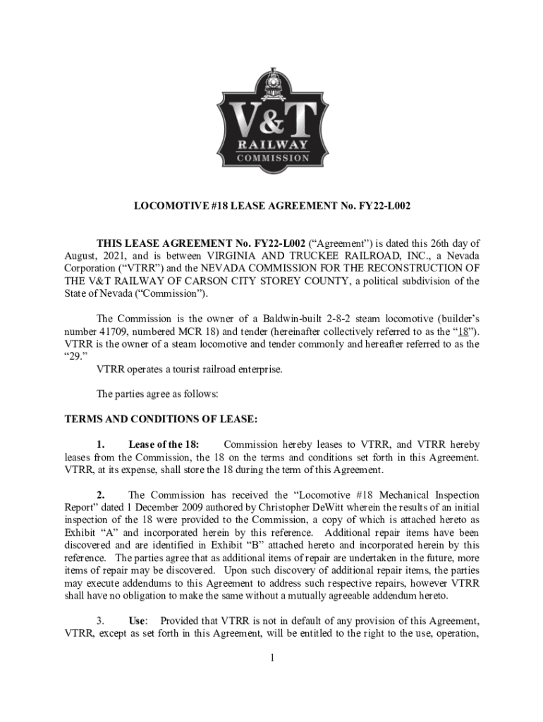 LOCOMOTIVE #18 LEASE AGREEMENT No. FY22L002 THIS LEASE AGREEMENT No. FY22L002 (Agreement) is dated this 26th day of August 2021, and is between VIRGINIA AND TRUCKEE RAILROAD, INC., a Nevada Corporation