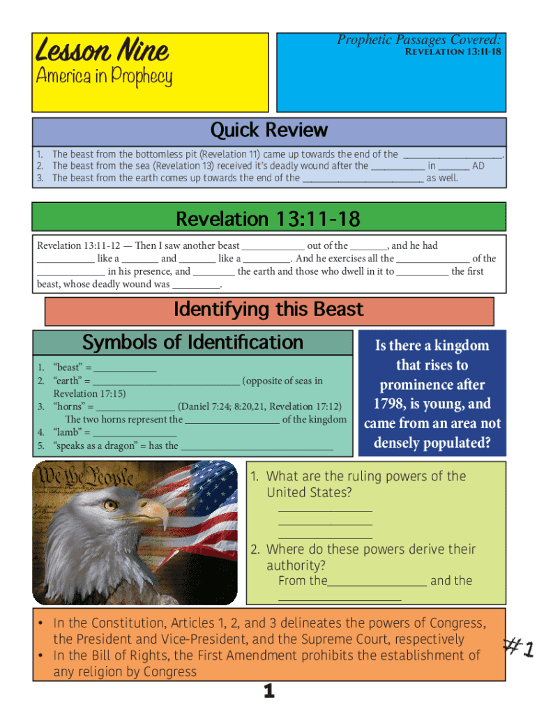 Lesson NineProphetic Passages Covered:Revelation 13:1118America in ProphecyQuick Review1. The beast from the bottomless pit (Revelation 11) came up towards the end of the ___.