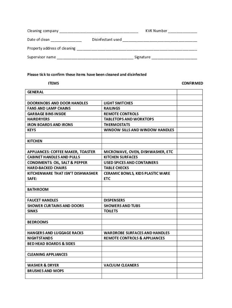 Cleaning company ___ Date of clean ___KVM Number ___Disinfectant used ___Property address of cleaning ___ Supervisor name ___ Signature ___Please tick to confirm these items have been cleaned and