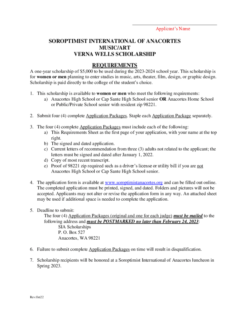 ___ Applicants NameSOROPTIMIST INTERNATIONAL OF ANACORTES MUSIC/ART VERNA WELLS SCHOLARSHIP REQUIREMENTS A one-year scholarship of $5,000 to be used during the 20232024 school year. This scholarship
