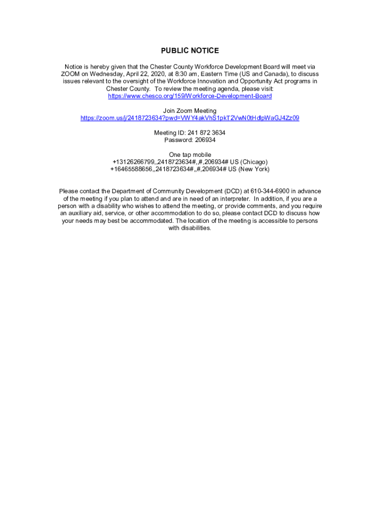 Get the free Notice is hereby given that the Chester County Workforce Development Board will meet...