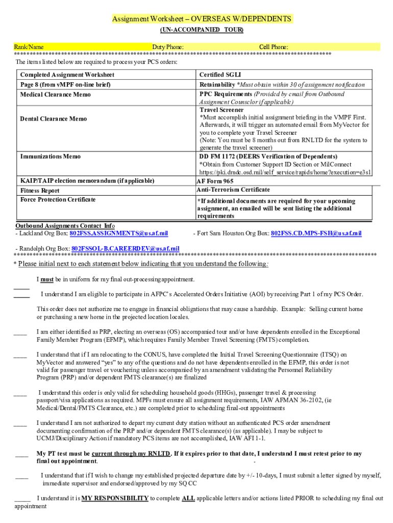Assignment Worksheet OVERSEAS W/DEPENDENTS (UNACCOMPANIED TOUR) Rank/Name Duty Phone: Phone: ***************************************************************************************************** The