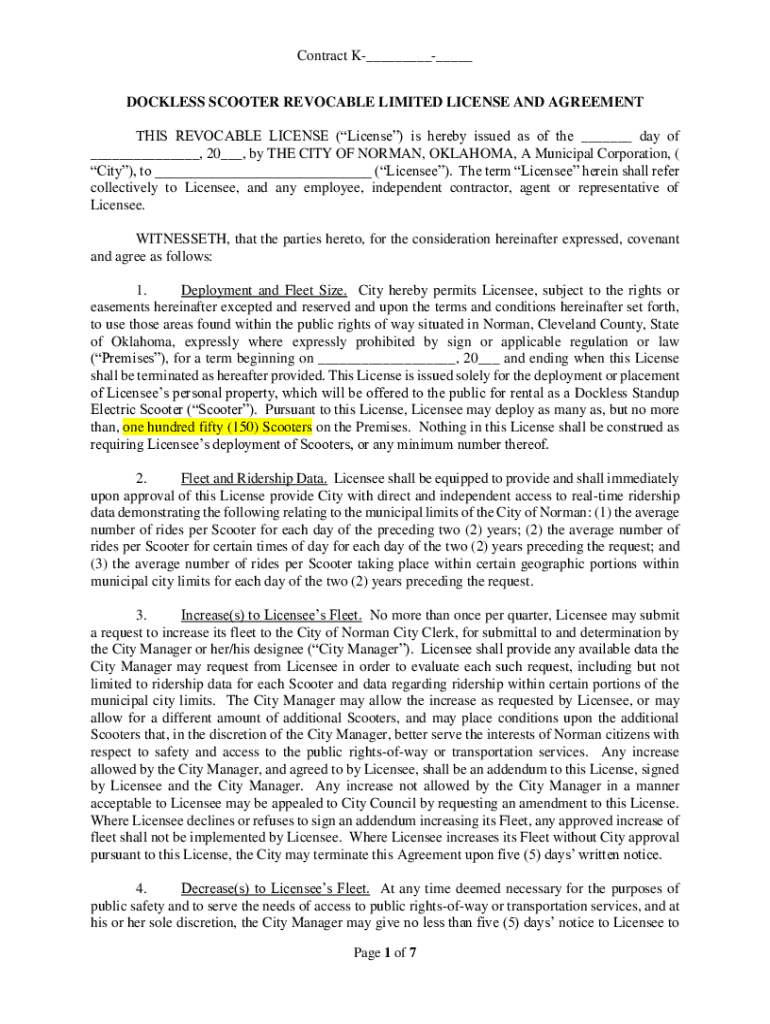 Contract K______ LOCKLESS SCOOTER REVOCABLE LIMITED LICENSE AND AGREEMENT THIS REVOCABLE LICENSE (License) is hereby issued as of the ___ day of ___, 20___, by THE CITY OF NORMAN, OKLAHOMA, A Municipal