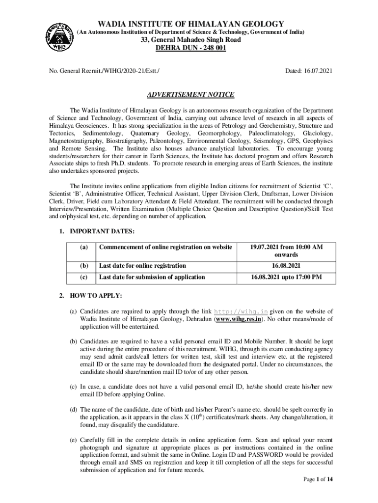 NADIA INSTITUTE OF HIMALAYAN GEOLOGY (An Autonomous Institution of Department of Science & Technology, Government of India)33, General Amadeo Singh Road DEBRA DUN 248 001 No. General Recruit./WING/202021/EST./Dated: