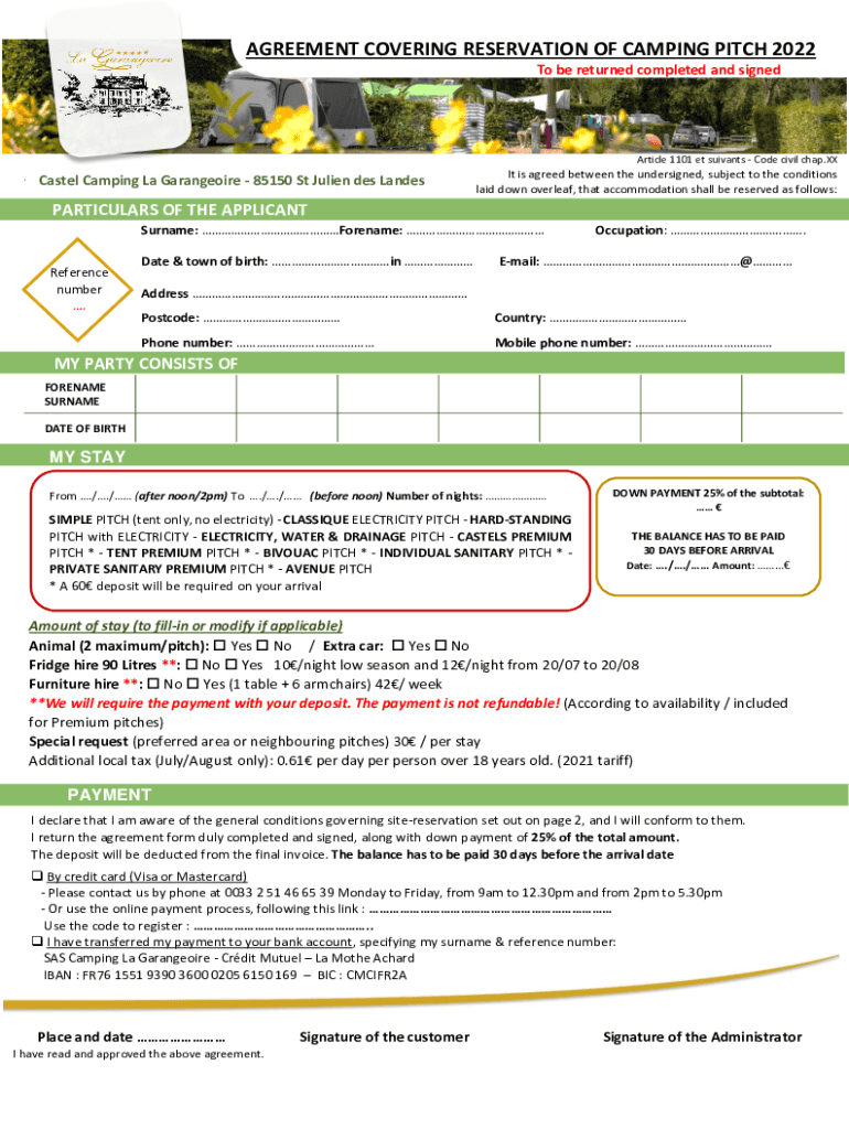 AGREEMENT COVERING RESERVATION OF CAMPING PITCH 2022 To be returned completed and signedArticle 1101 ET servants Code civil chap. Castle Camping La Grangerize 85150 St Julien DES Landsat is agreed