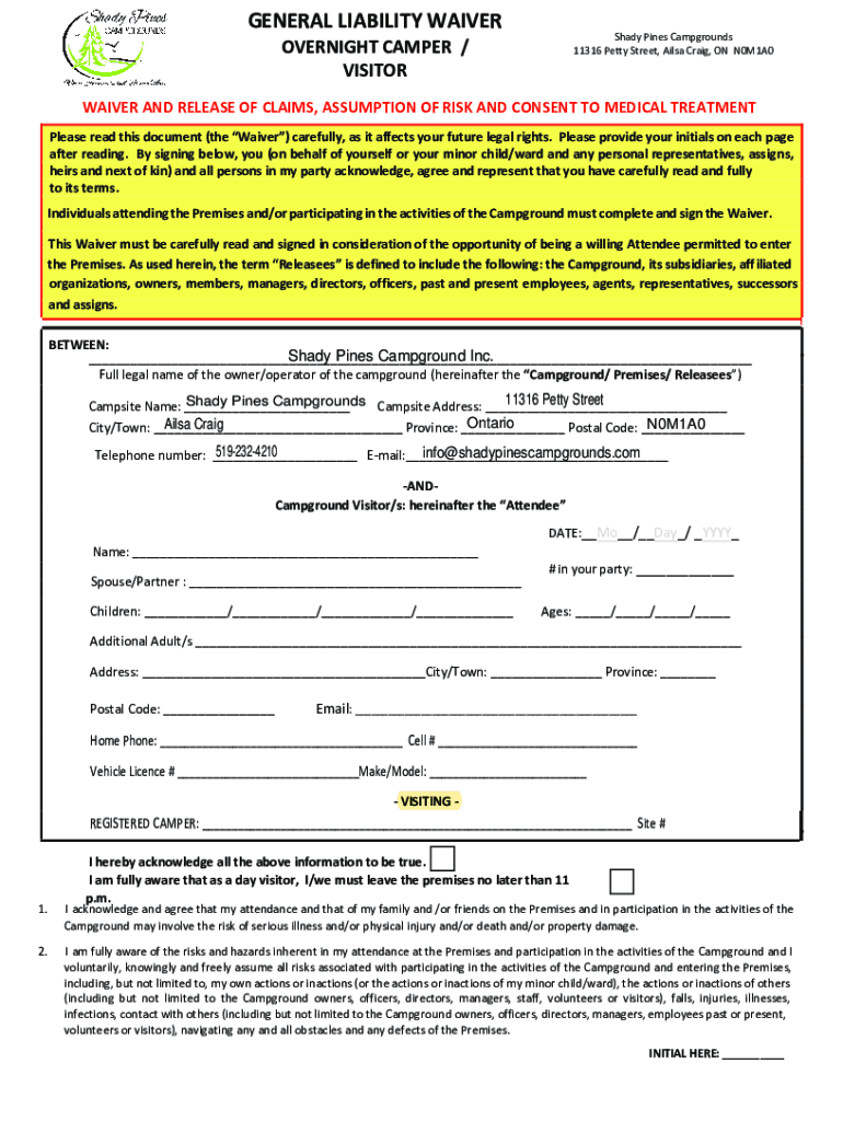 GENERAL LIABILITY WAIVERShady Pines Campgrounds 11316 Petty Street, Alisa Craig, ON N0M1A0OVERNIGHT CAMPER / VISITORWAIVER AND RELEASE OF CLAIMS, ASSUMPTION OF RISK AND CONSENT TO MEDICAL TREATMENT