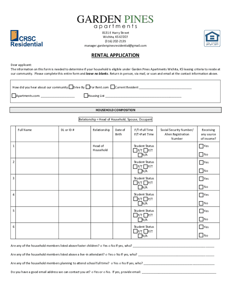 8131 E Harry Street Wichita, KS 67207 (316) 2022135 manager.gardenpinesresidential@gmail.comRENTAL APPLICATION Dear applicant: The information on this form is needed to determine if your household
