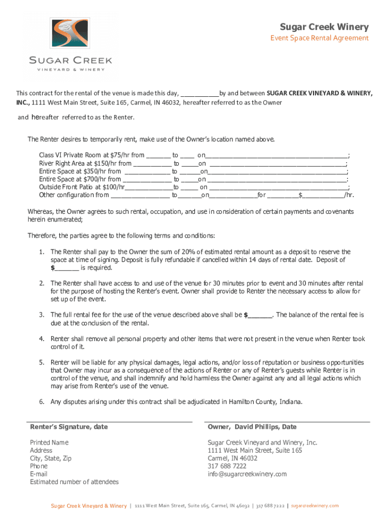 Sugar Creek Winery Event Space Rental Agreement This contract for the rental of the venue is made this day, ___by and between SUGAR CREEK VINEYARD & WINERY, INC., 1111 West Main Street, Suite 165,