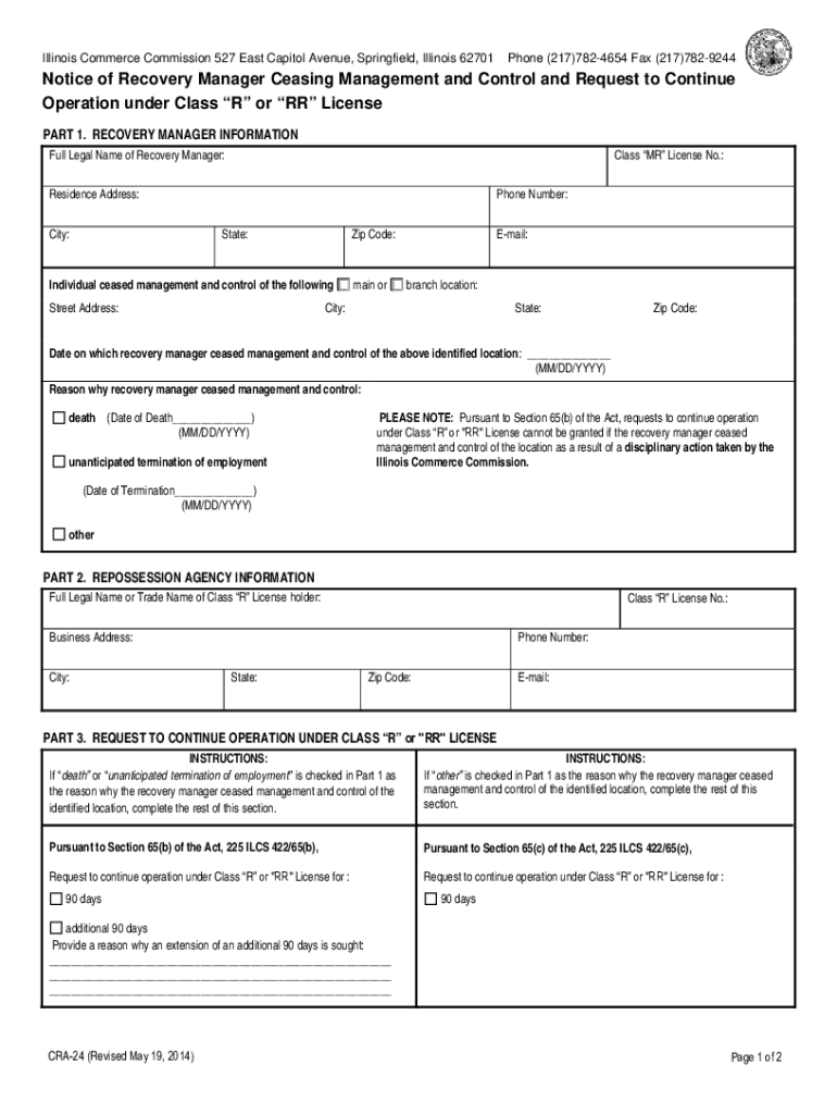 Illinois Commerce Commission 527 East Capitol Avenue, Springfield, Illinois 62701Phone (217)7824654 Fax (217)7829244Notice of Recovery Manager Ceasing Management and Control and Request to Continue