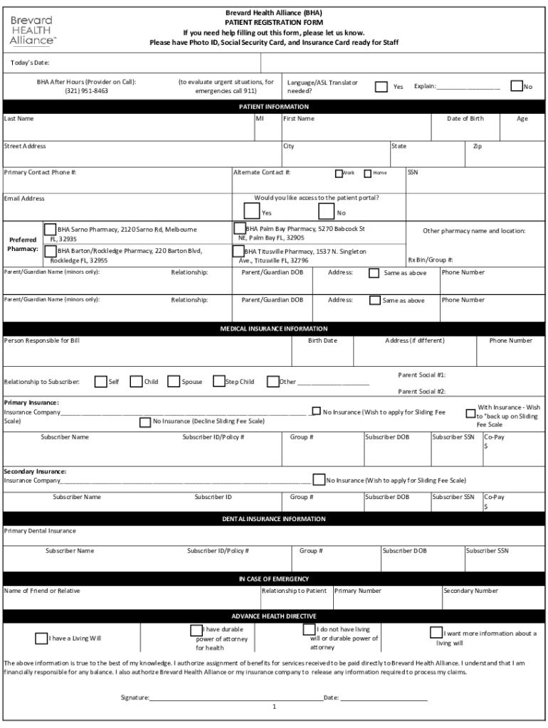 Brevard Health Alliance (BHA) PATIENT REGISTRATION FORM If you need help filling out this form, please let us know. Please have Photoed ID, Social Security Card, and Insurance Card ready for Staff
