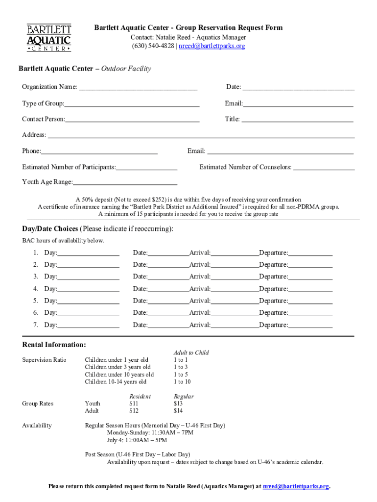 Bartlett Aquatic Center Group Reservation Request Form Contact: Natalie Reed Aquatics Manager (630) 5404828 | nreed@bartlettparks.orgBartlett Aquatic Center Outdoor Facility Organization Name: ___Date: