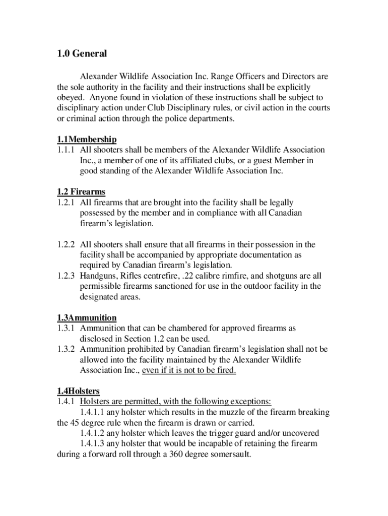 1.0 General Alexander Wildlife Association Inc. Range Officers and Directors are the sole authority in the facility and their instructions shall be explicitly obeyed. Anyone found in violation of