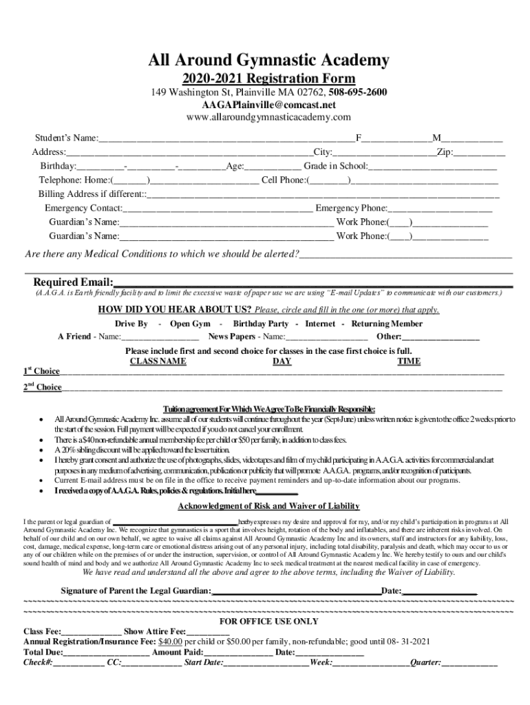 All Around Gymnastic Academy 20202021 Registration Form 149 Washington St, Blainville MA 02762, 5086952600 AAGAPlainville@comcast.net www.allaroundgymnasticacademy.com Students Name:___F___M___ Address:___City:___Zip:___