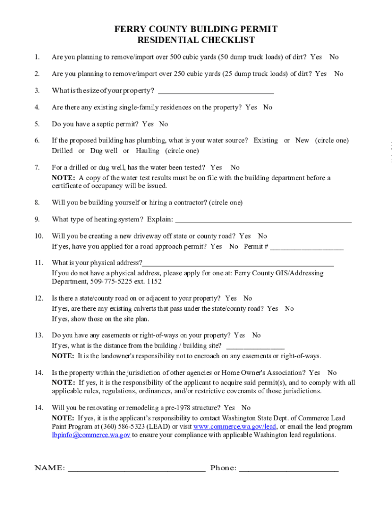FERRY COUNTY BUILDING PERMIT RESIDENTIAL CHECKLIST 1. Are you planning to remove/import over 500 cubic yards (50 dump truck loads) of dirt? YesNo2. Are you planning to remove/import over 250 cubic
