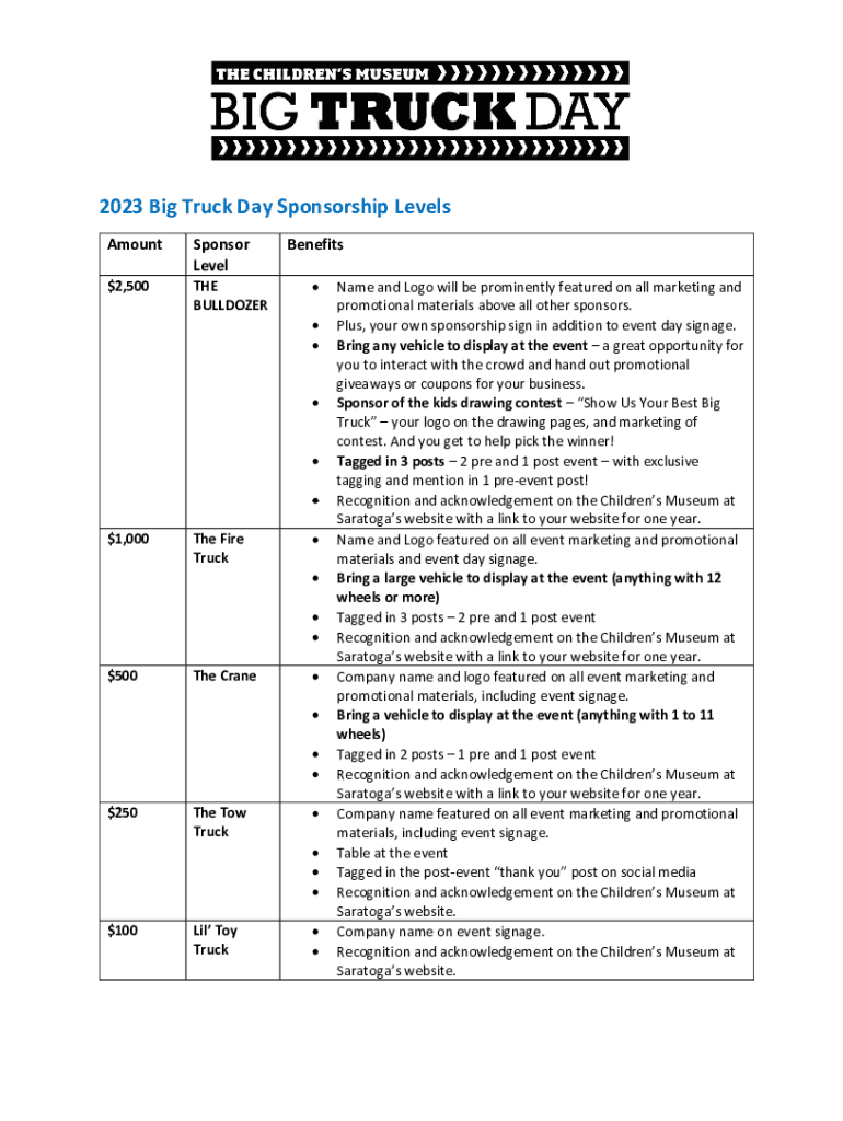 2023 Big Truck Day Sponsorship Levels AmountSponsor Level$2,500THE BULLDOZERBenefits $1,000The Fire Truck $500The Crane $250The Tow Truck $100Lil Toy Truck Name and Logo will be prominently featured