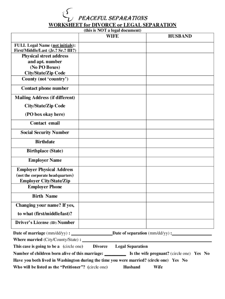 Peaceful Separations WORKSHEET for DIVORCE or LEGAL SEPARATION (this is NOT a legal document)WIFEHUSBANDFULL Legal Name (not initials): First/Middle/Last (Jr.? Sr.? III?) Physical street address and