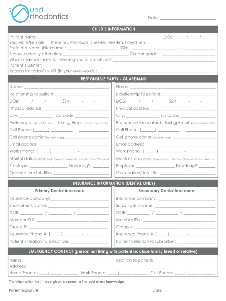 Date: ___ CHILD INFORMATION Patient Name: ___ DOB: ___ /___ /___ Sex: Male/Female Preferred Pronouns: She/Her, He/Him, They/Them Preferred Name (Nickname): ___ SSN: ___ ___ ___ School currently attending: