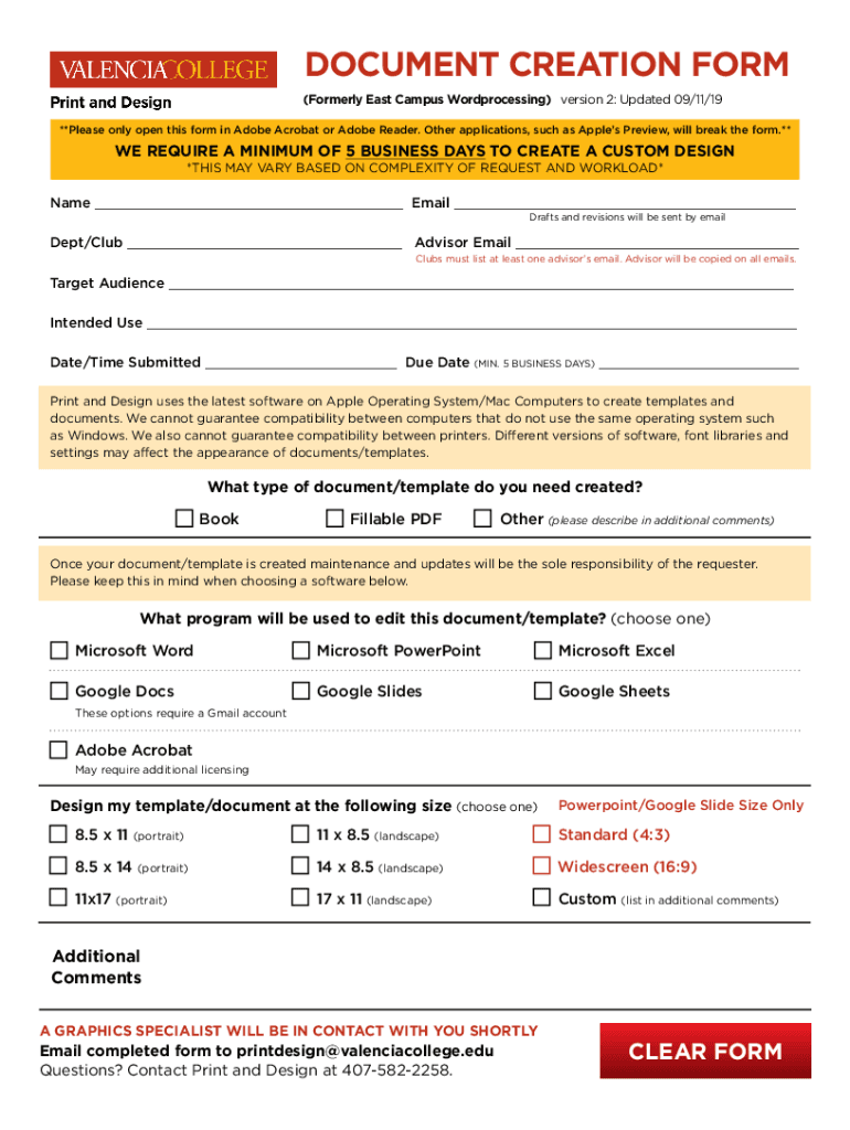 DOCUMENT CREATION FORM (Formerly East Campus Word processing) version 2: Updated 09/11/19 **Please only open this form in Adobe Acrobat or Adobe Reader. Other applications, such as Apples Preview,