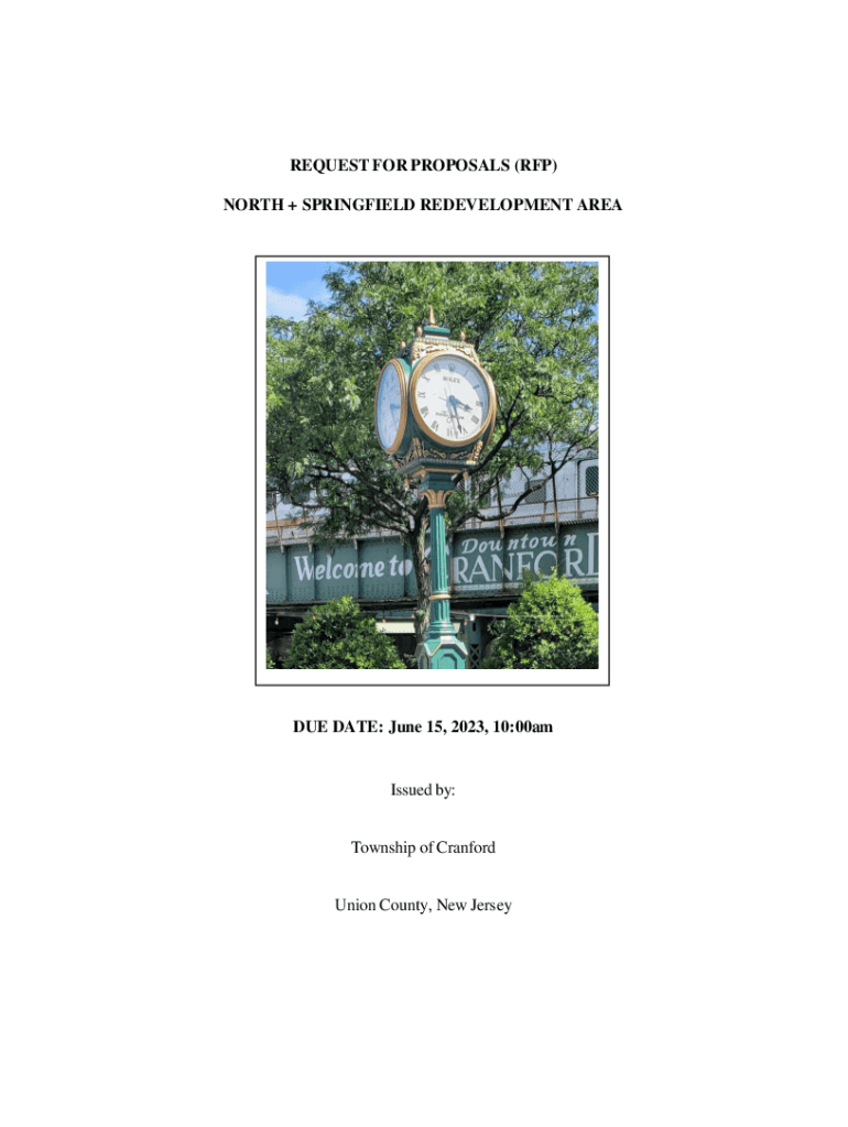 REQUEST FOR PROPOSALS (RFP) NORTH + SPRINGFIELD REDEVELOPMENT ARCADE DATE: June 15, 2023, 10:00amIssued by: Township of CranfordUnion County, New Versatile OF CONTENTS GLOSSARY...IIT SECTION 1: INTRODUCTION