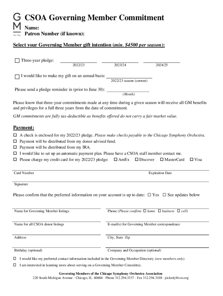 CSA Governing Member Commitment Name: Patron Number (if known): Select your Governing Member gift intention (min. $4500 per season): Threader pledge:2022/23 I would like to make my gift on an annual