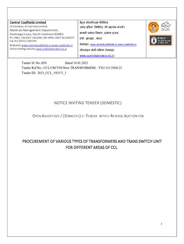 Central Coalfields Limited (A Subsidiary of Coal India Limited)()Materials Management Department, Darshan House, Ranchi Jharkhand 834001, pH: (PBX): 2361687/ 2361694; GM (MM) 2360716/2360257 Fax (91)