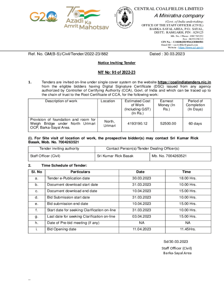 CENTRAL COALFIELDS LIMITED Minivan company1(Govt. of India undertaking) OFFICE OF THE STAFF OFFICER (CIVIL) BARKASAYAL AREA, P.O.: SAY AL, DIST.: RAMPART, PIN : 829125 Mb. No. / Phone : 8987785252