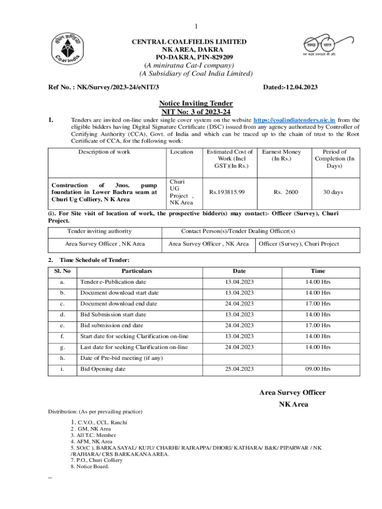 1 CENTRAL COALFIELDS LIMITED NK AREA, DATA POLAR, PIN829209(A minivan Cat company) (A Subsidiary of Coal India Limited) Ref No. NK/Survey/202324/ENIT/3Dated:12.04.2023Notice Inviting Tender NIT No: