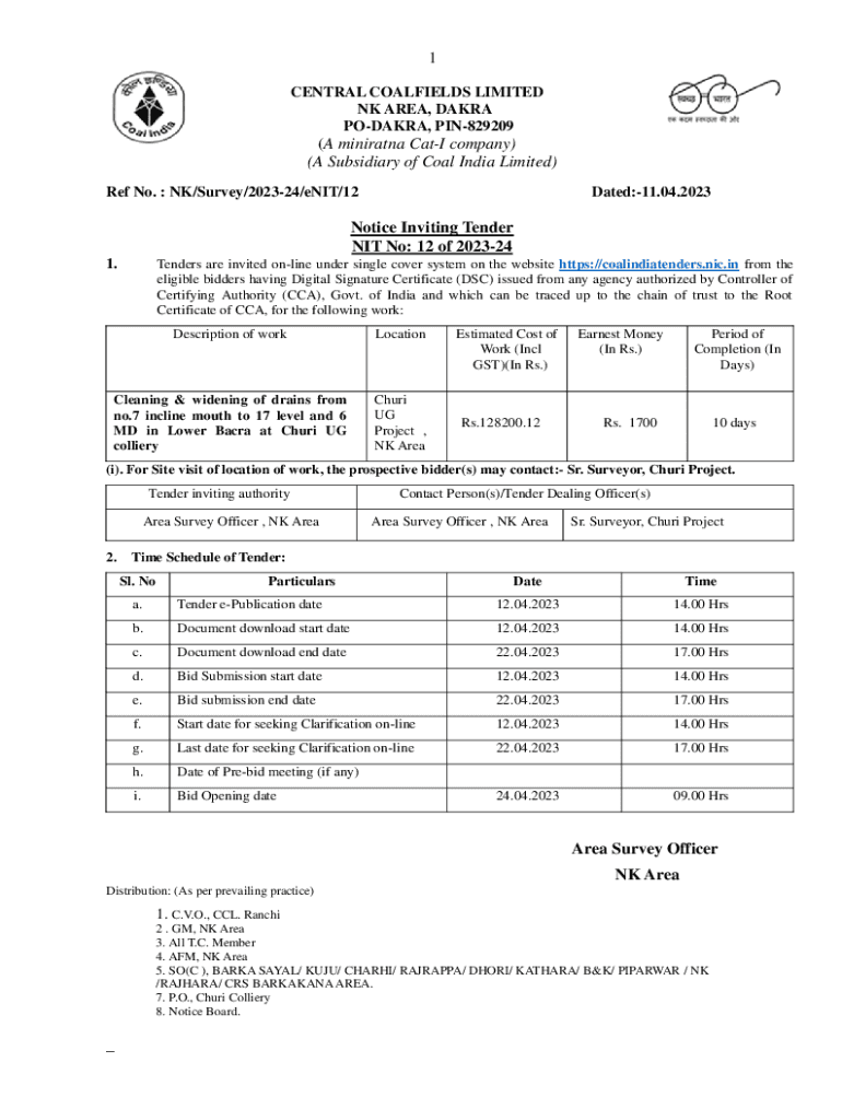 1 CENTRAL COALFIELDS LIMITED NK AREA, DATA POLAR, PIN829209(A minivan Cat company) (A Subsidiary of Coal India Limited) Ref No. NK/Survey/202324/ENIT/12Dated:11.04.2023Notice Inviting Tender NIT No: