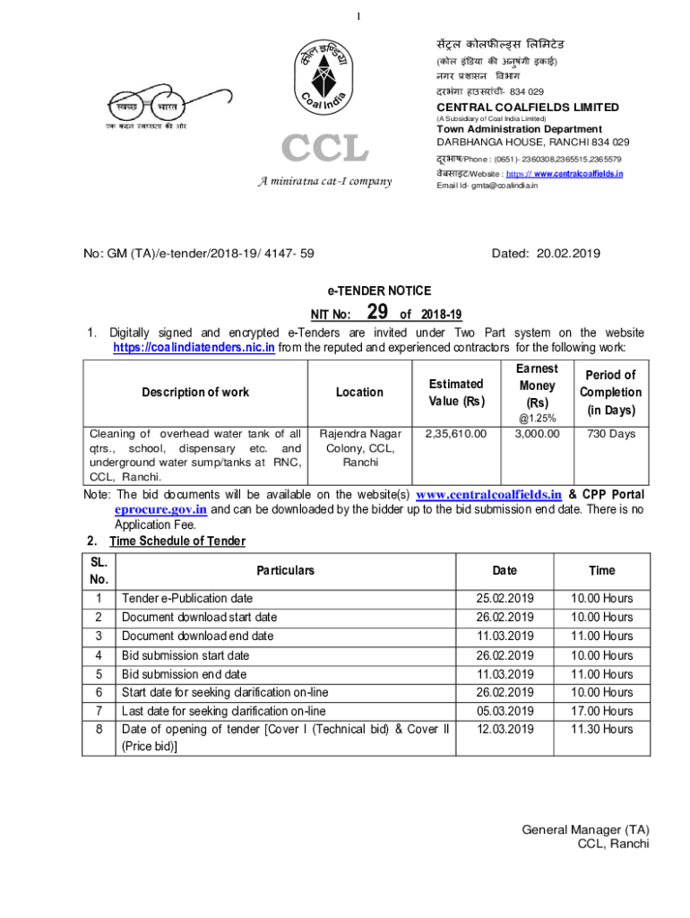 (A Subsidiary of Coal India Limited)Town Administration Department