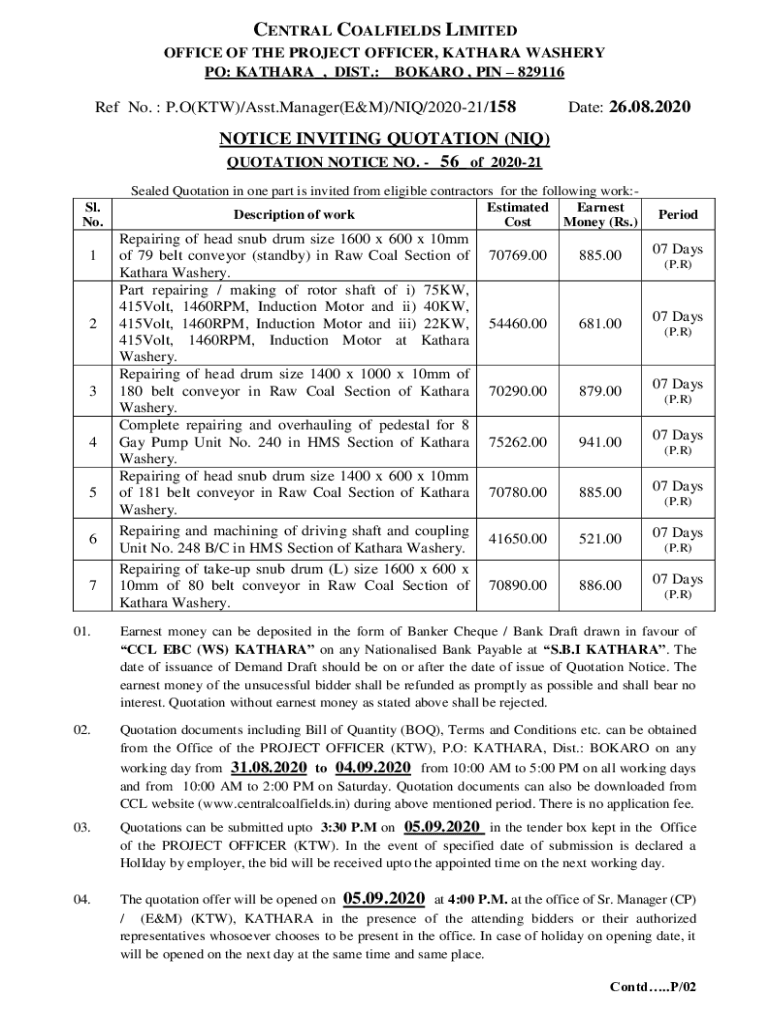 CENTRAL COALFIELDS LIMITED OFFICE OF THE PROJECT OFFICER, SAHARA WASHER PO: SAHARA_, DIST.: BOARD, PIN 829116Ref No. : P. O(BTW)/Asst. Manager(E&M)/IQ/202021/158Date: 26.08.2020NOTICE INVITING QUOTATION