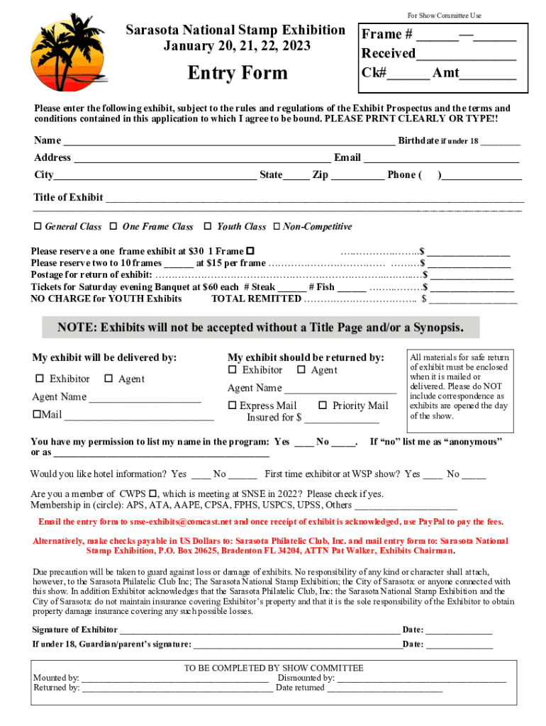 To fill out the Sarasota National Stamp Exhibition paperwork, participants need to provide information about the stamps they are showcasing, their contact details, and any special categories they wish to enter.