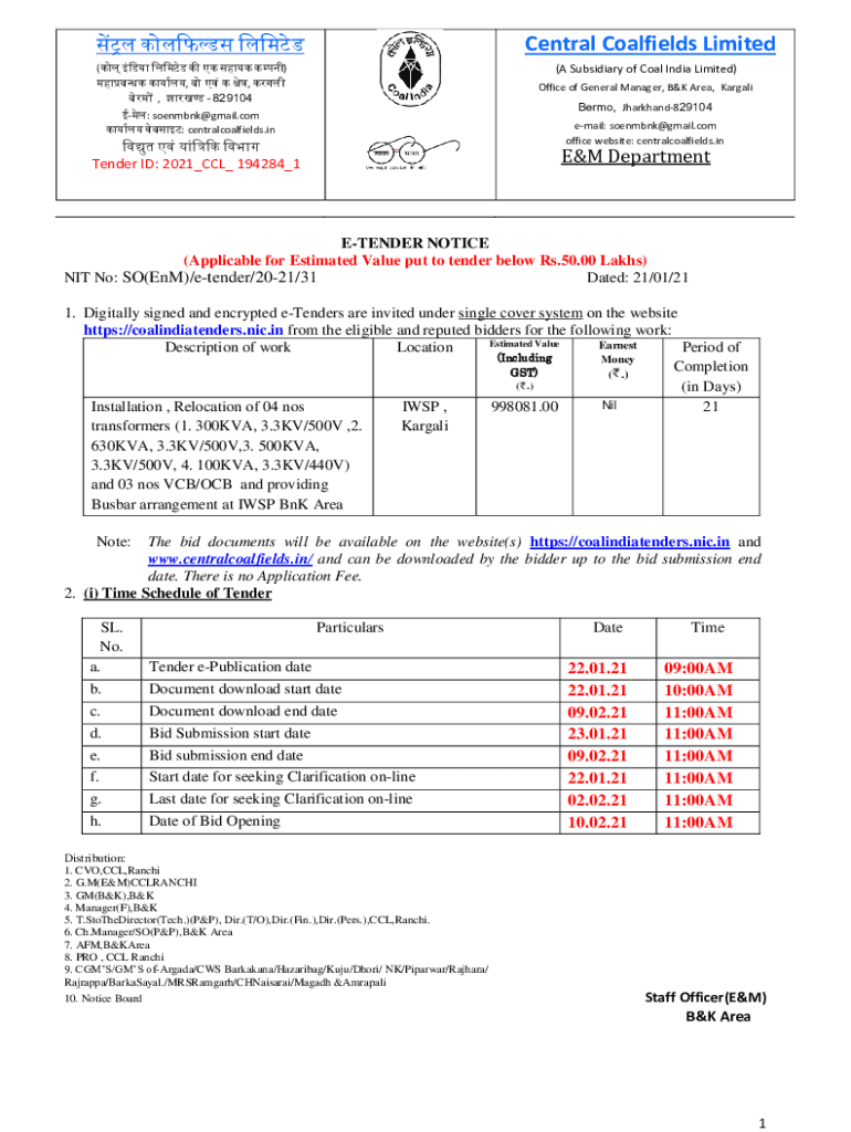 Central Coalfields Limited(), ,, 829104(A Subsidiary of Coal India Limited) Office of General Manager, B&K Area, Kigali Berm, Jharkhand829104: soenmbnk@gmail