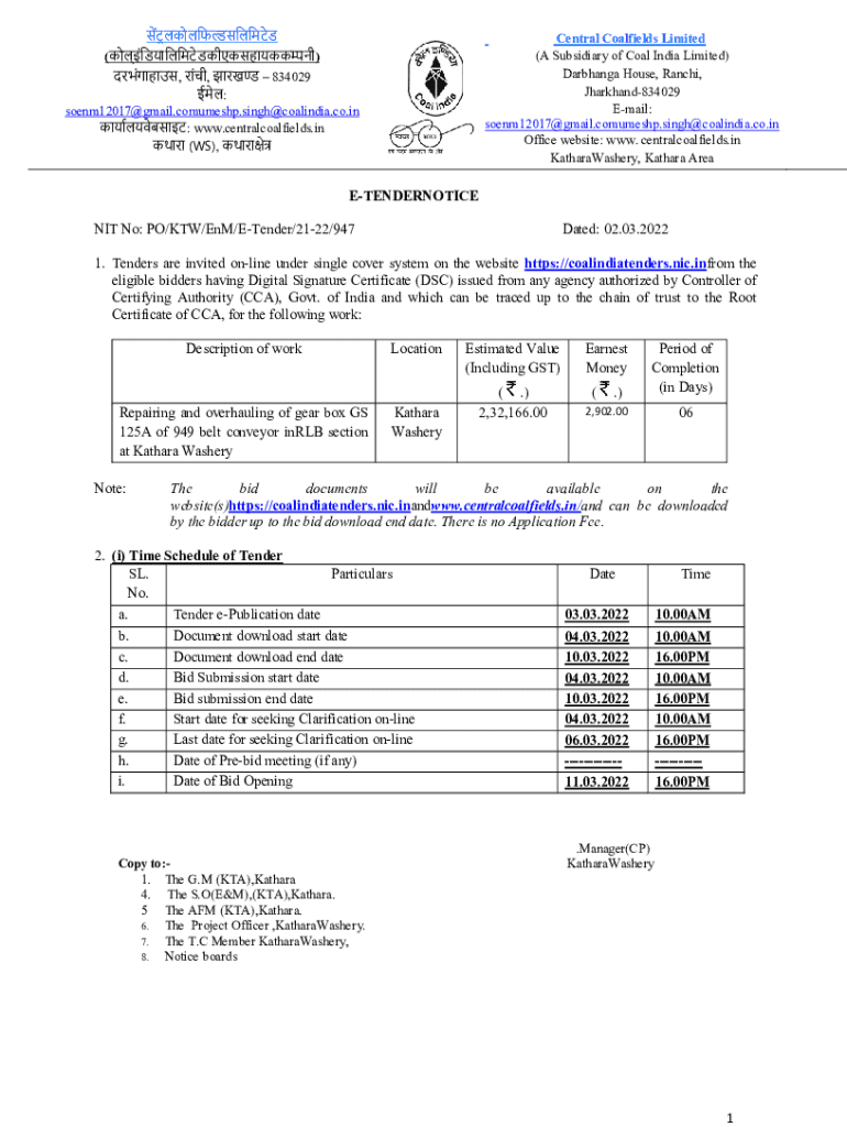 Central Coalfields Limited (A Subsidiary of Coal India Limited) Darshan House, Ranchi, Jharkhand834029 Email: soenm12017@gmail.comumeshp.singh@coalindia.co.in OfficeWWWbsCentralcoalfieldscoalHathawayn