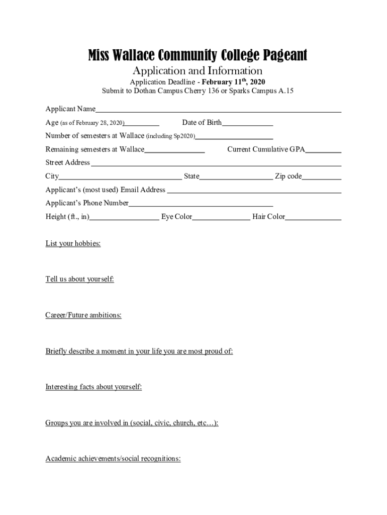 Miss Wallace Community College Pageant Application and InformationApplication Deadline February 11th, 2020 Submit to Dothan Campus Cherry 136 or Sparks Campus A.15 Applicant Name Age (as of February