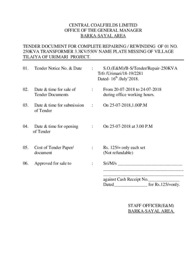 TENDER DOCUMENT FOR COMPLETE REPAIRING / REWINDING OF 01 NO.