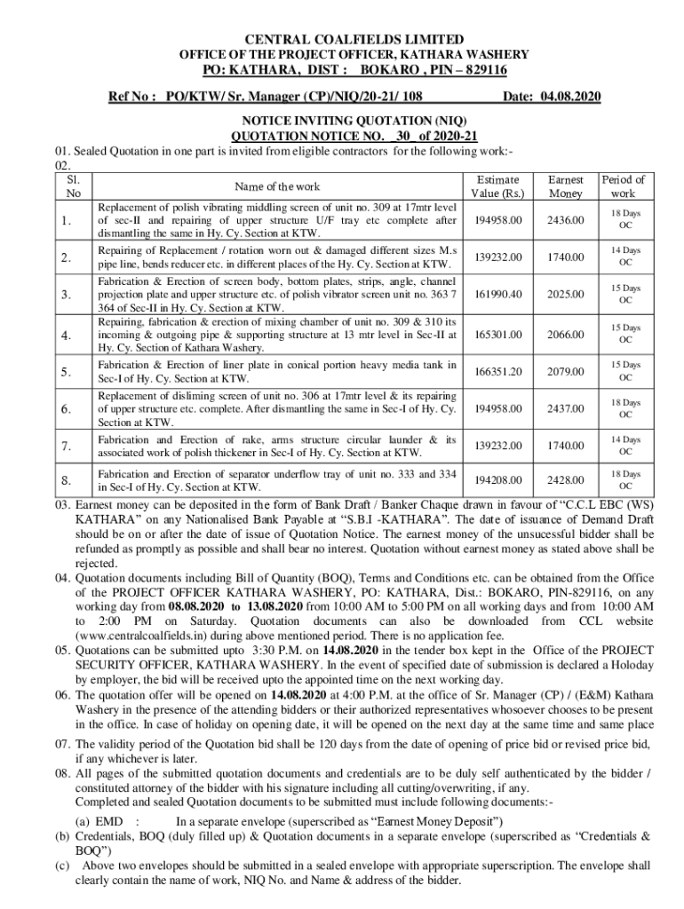 CENTRAL COALFIELDS LIMITED OFFICE OF THE PROJECT OFFICER, SAHARA WASHER: SAHARA, DIST : BOARD, PIN 829116 Ref No : PO/BTW/ Sr. Manager (CP)/IQ/2021/ 108Date: 04.08.2020NOTICE INVITING QUOTATION (IQ)