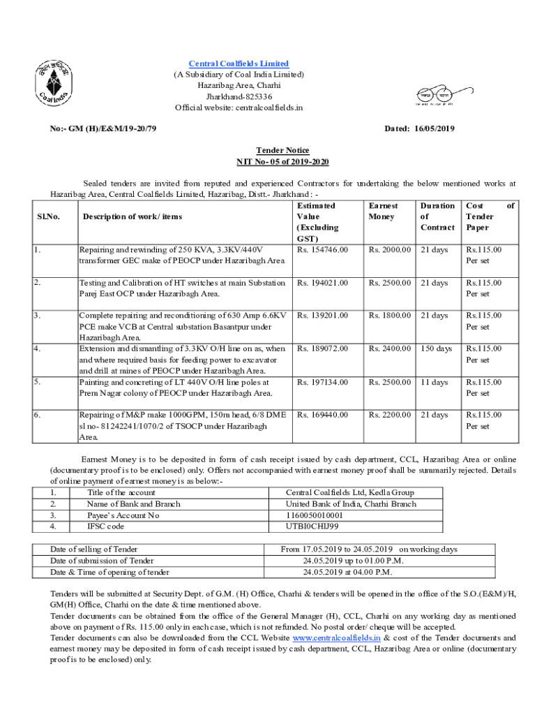 Central Coalfields Limited (A Subsidiary of Coal India Limited) Hazarding Area, Char hi Jharkhand825336 Official website: central coalfields.in No: GM (H)/E&M/1920/79Dated: 16/05/2019 Tender Notice