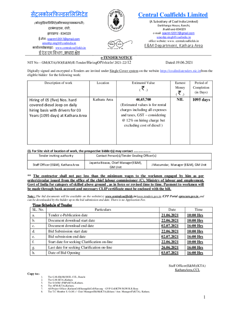 Central Coalfields Limited()(A Subsidiary of Coal India Limited) Darshan House, Ranchi, Jharkhand834029 email: soenm12017@gmail.com umeshp.singh@coalindia.in office website: WWW. Central coalfields.in,
