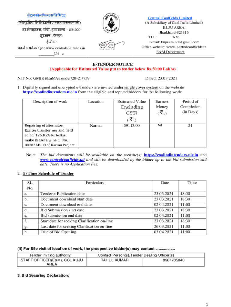 Central Coalfields Limited (A Subsidiary of Coal India Limited) KU JU AREA, Jharkhand825316 TEL: FAX: Email: kuju.em.ccl@gmail.com Office website: WWW. Central coalfields.in E&M Department(), 834029
